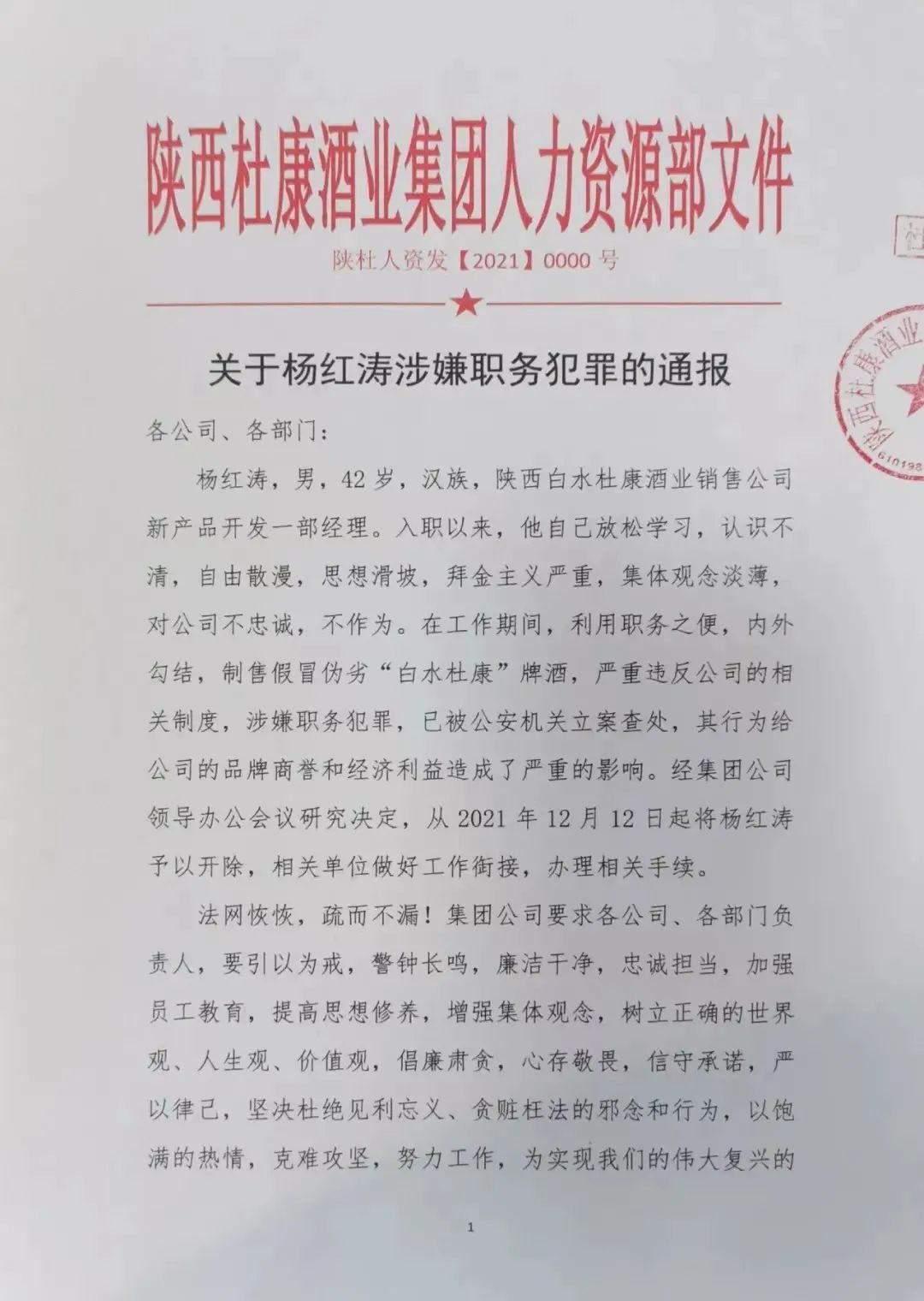 公司根據(jù)根據(jù)勞動法、公司員工手冊等相關規(guī)定,經公司領導研究決定給予楊紅濤解除勞動合同的處理。公司堅決打擊一切違法違紀行為,對任何觸碰職業(yè)道德和法律紅線的行為零容忍,對任何人、在任何時候,都絕不放松!