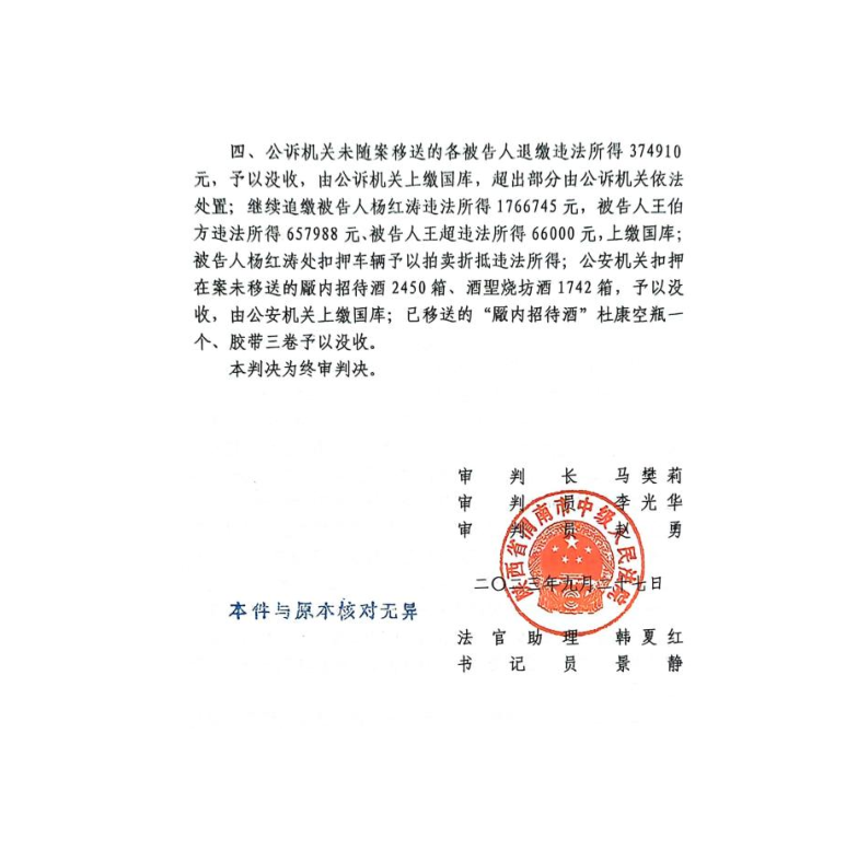 楊洪濤原系白水杜康酒業(yè)銷售公司部門經(jīng)理,利用在多年的工作中掌握的信息資源和渠道,伙同他人及少數(shù)經(jīng)銷商制假造假,生產(chǎn)、銷售知名品牌白水杜康系列白酒產(chǎn)品,由于制售假冒產(chǎn)品,雖然流入市場量很少,但是已經(jīng)造成了惡劣的影響,給酒廠造成了大量的成品貨庫存積壓,無法銷售,對白水杜康的品牌聲譽(yù)和陜西杜康酒業(yè)集團(tuán)造成了重大傷害和經(jīng)濟(jì)損失。
